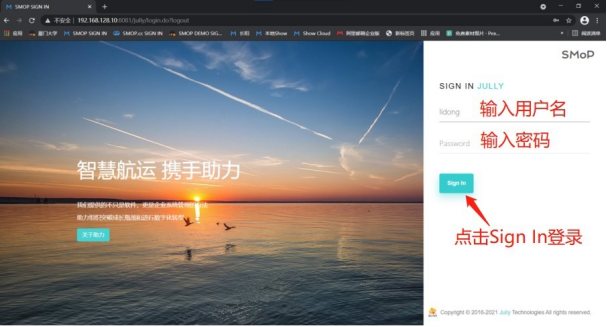 在登录画面中,录入正确的用户名和密码,点击 Sign In 按钮即可登录。(用户公司已使用 SMOP 系统”船舶配员“模块时系统登录用户名为个人姓名汉语拼音小写(无空格),未上线船舶配员模块时系统登录用户名为船员任职岗位名称的汉语拼音小写(无空格),初始登录密码 123456。